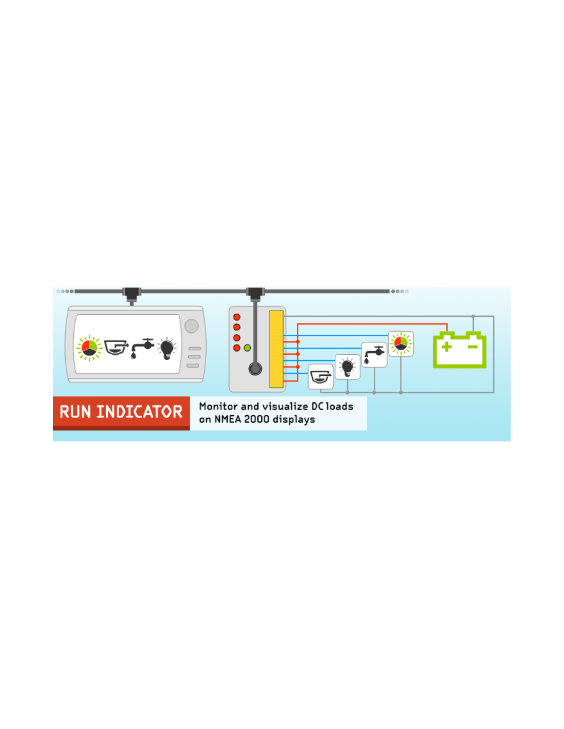 L'indicateur de fonctionnement est conçu pour visualiser et surveiller le courant et la tension électriques dans un maximum de quatre circuits CC indépendants connectés aux bornes de l'appareil. Les données de tension et de courant peuvent être visualisées sur des écrans NMEA 2000 pour vérifier l'état des charges commutées manuellement (par exemple, les feux de navigation) et garantir le bon fonctionnement des équipements sous tension (le courant circule dans la charge).